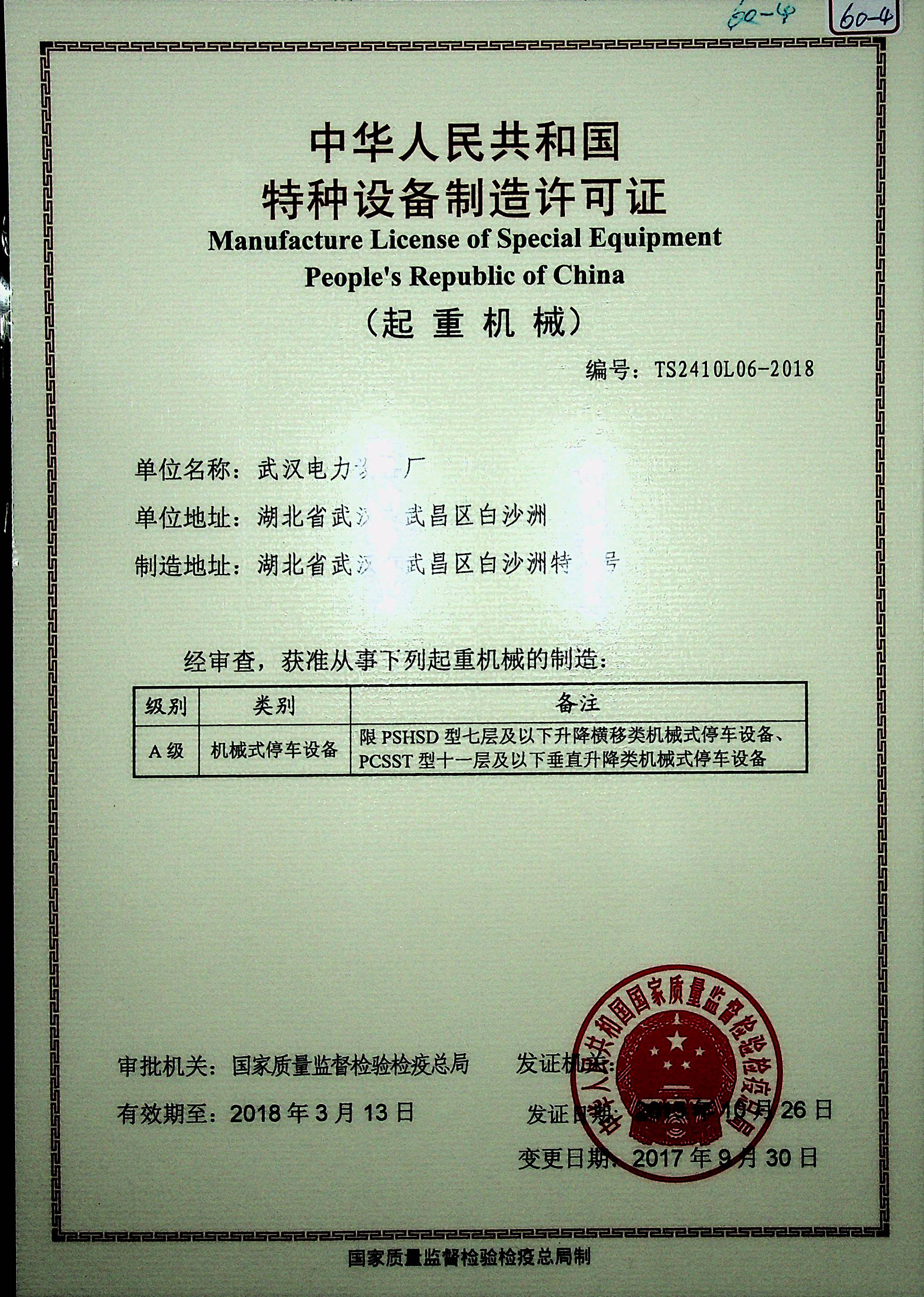 特种设备制造许可证(机械式停车设备)——PSHSD型七层、PXSST型十一层